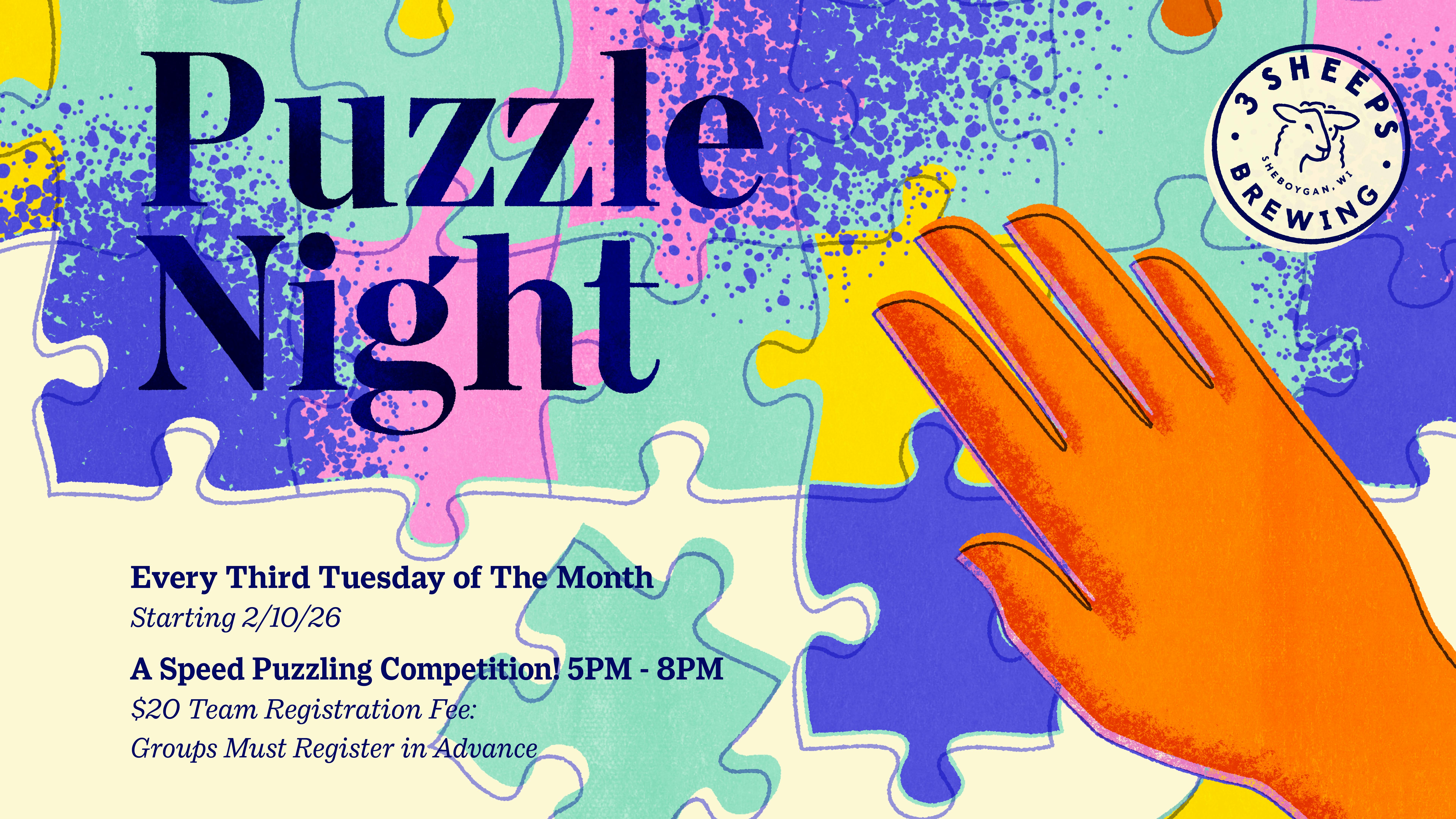 Clear the table, focus up, and start sorting edges. Our Speed Puzzling Competition is all about teamwork, strategy, and how fast you can piece it all together. Teams of up to four will compete to finish a 500-piece puzzle in record time. Entry is $20 per team, and each group takes their puzzle home afterward.